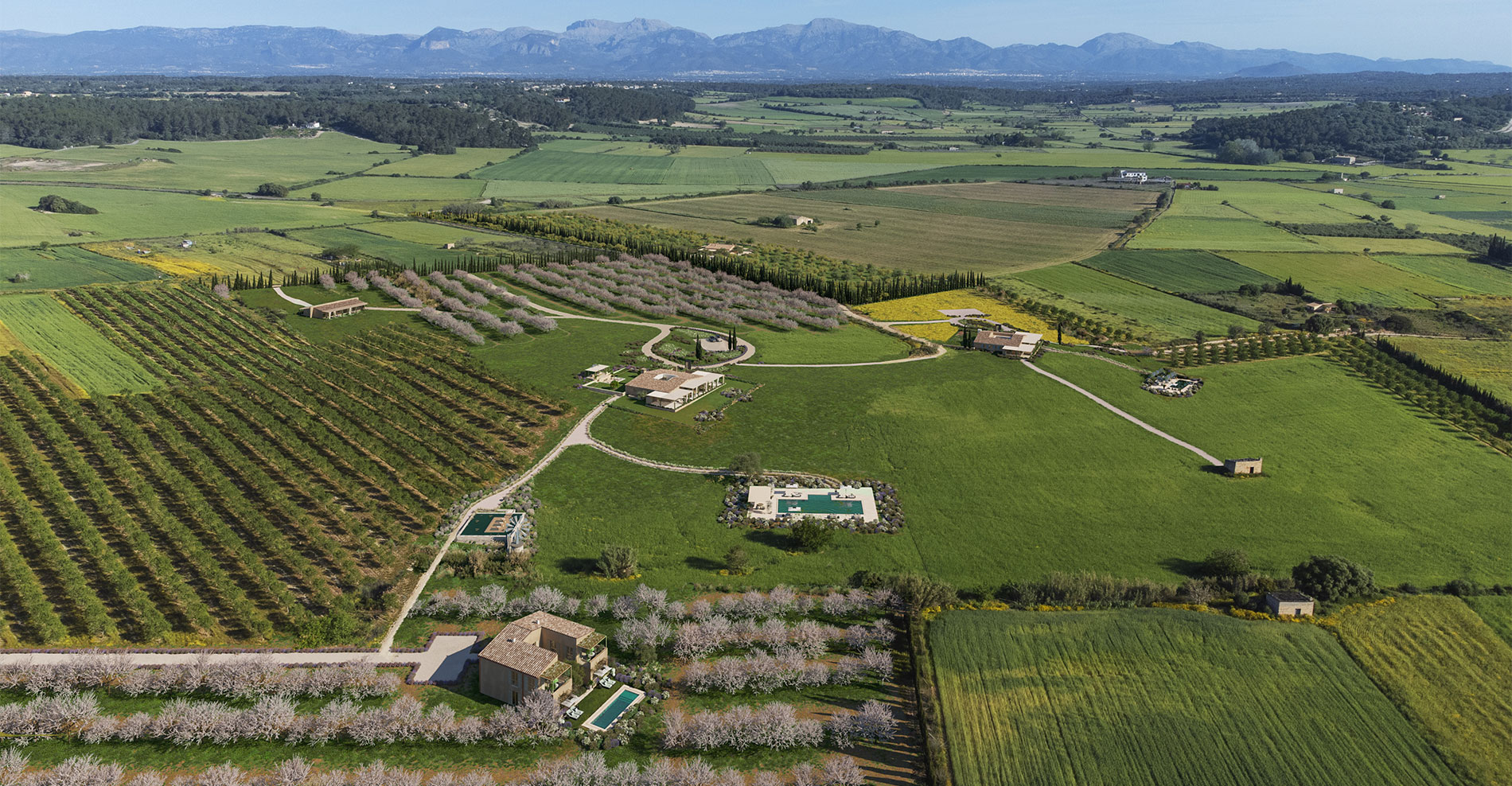 Standing in the middle of this unique property; nestled amidst an undulating almond grove, your gaze rests on the Randa Mountain on the side and the imposing Randa Mountain on the other. You feel a sense of calm protection as serenity engulfs you. You instantly understand why the owners decided to name this place Son Rahaa. Rahaa means rest, comfort, happiness, freedom and bliss.
