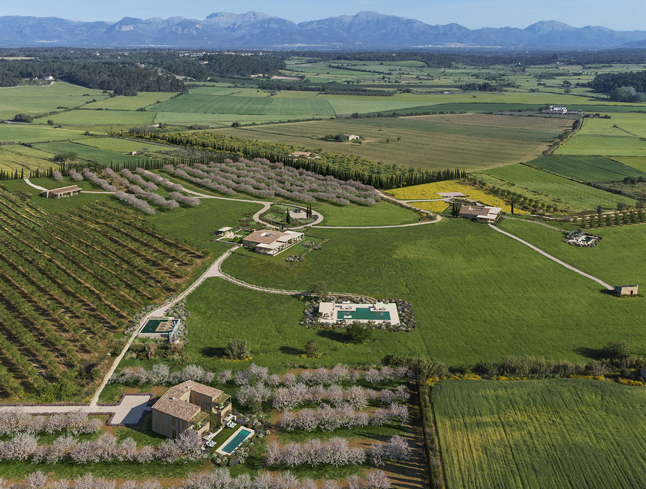 In Imperial Feng Shui, which hails from the Imperial Court of China, 70 percent of the feng shui of any property is the outside and 30 percent is the inside of a home. Son Rahaa was chosen as the Tramuntana Mountains in the North West, Randa Mountain in the South and the church steeple in Montuiri in the East, form a perfect golden triangle that is incredibly rare to come by in feng shui. Its positioning enhances health, wealth, and happiness for whoever lives there.To further capture the magic of this location, the houses have been intentionally built to face 94 degrees South-East. Every single house, both inside and outside, has been meticulously planned in collaboration with the feng shui master.